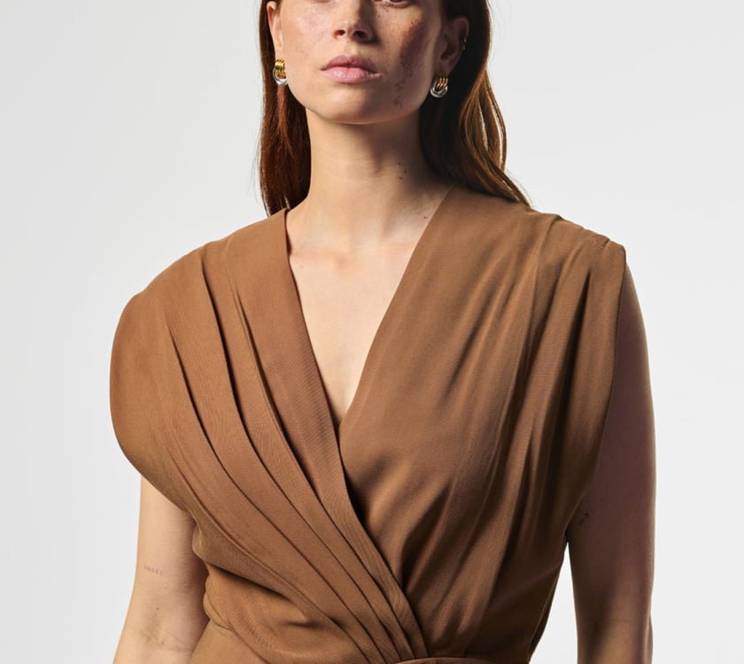 Deze feestelijke jurk van Aaiko is uitgevoerd in een hazelnootbruine tint en heeft een V-hals. Het model heeft een normale pasvorm en is gemaakt van polyester en viscose. De overslag en verschillende plooiverwerkingen geven het ontwerp een uitgesproken lijn, terwijl de gladde voering aan de binnenkant voor een verzorgde afwerking zorgt. Een blinde ritssluiting in de zijnaad werkt het geheel netjes af. Combineer de jurk met een verfijnde hak voor een rustige, stijlvolle uitstraling met zelfvertrouwen.