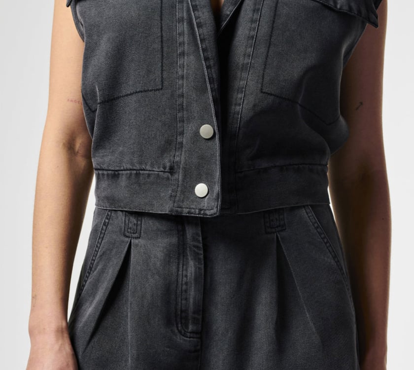 De Lies Ten 522 van Aaiko is een grijs gilet voor dames met een V-hals en een normale pasvorm. Het model heeft de uitstraling van een bodywarmer en is gemaakt van tencel in een gewassen grijstint. Geheel gevoerd en de achterzijde is afgewerkt met een elastische band, terwijl de voorkant sluit met twee drukkers. Voor een complete set combineer je dit gilet met de Eline bermuda pants. Een helder ontwerp dat rustig en verzorgd oogt.