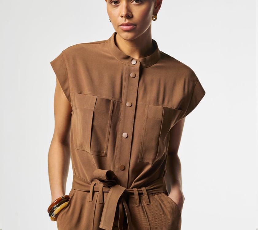 Deze bruine jumpsuit van Aaiko is uitgevoerd in een mix van polyester en viscose. Het model heeft een normale taille en een normale pasvorm, met rechte broekspijpen voor een heldere lijn. De drukkerssluiting en het strikbandje in de taille geven het ontwerp een praktische en verzorgde afwerking. Een doorgestikt plooinaadje voegt een subtiel detail toe. Draag hem met een blazer of los voor een rustige, zelfverzekerde uitstraling.