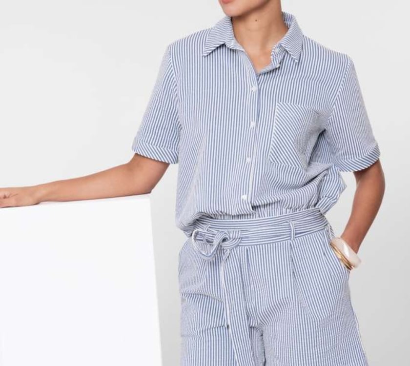 Deze blauwe blouse van Geisha heeft een blauw-wit geweven streeppatroon en een rustige, verzorgde uitstraling. Het model is uitgevoerd in een normale pasvorm met korte mouwen en een elastische rand aan de onderzijde. De mix van katoen, polyester en elastaan geeft de blouse een praktische samenstelling met lichte stretch. Een heldere keuze binnen de collectie dames blouses, passend bij het voorjaar en de zomer. Mooi te combineren met een effen broek of rok voor een verzorgde stijl.